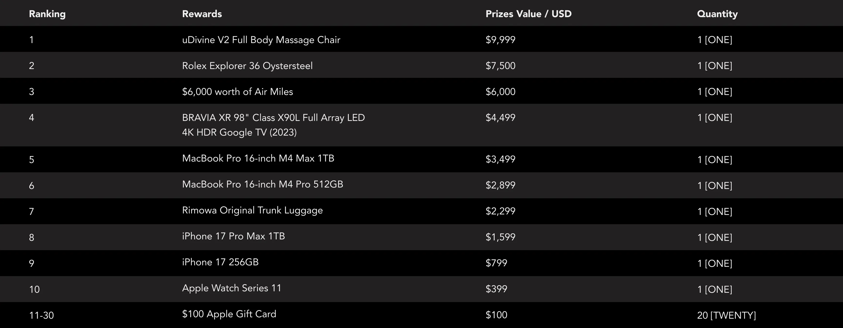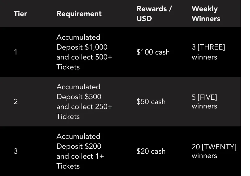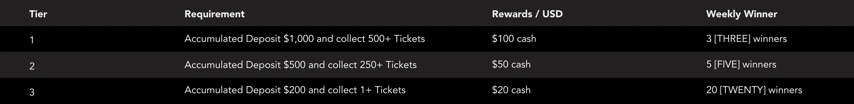 • a. Clients who reach Tier 1 will be qualified to join the Ticket Leaderboard. The Top 30 clients with the highest number of tickets will be rewarded with the following prizes: